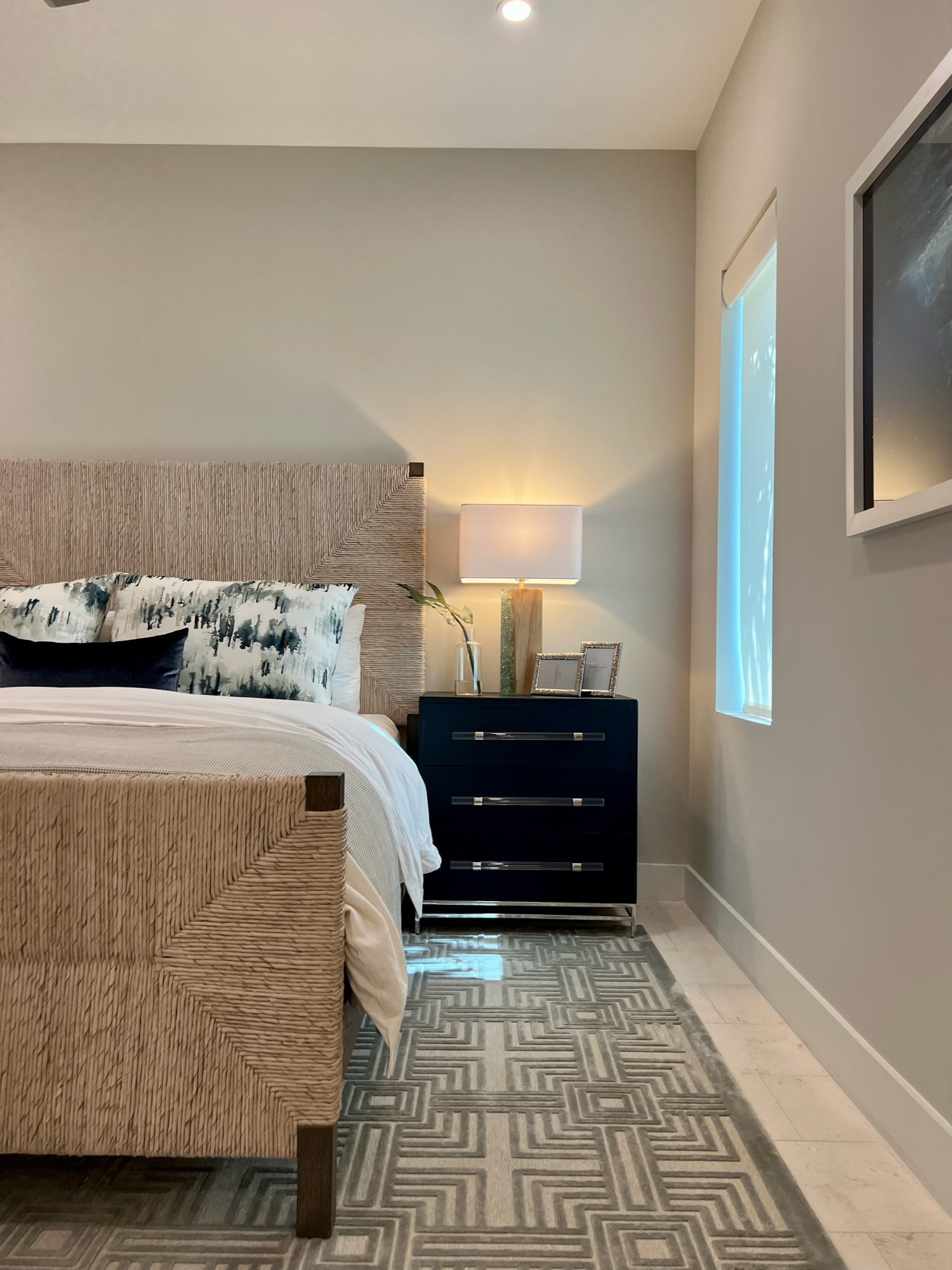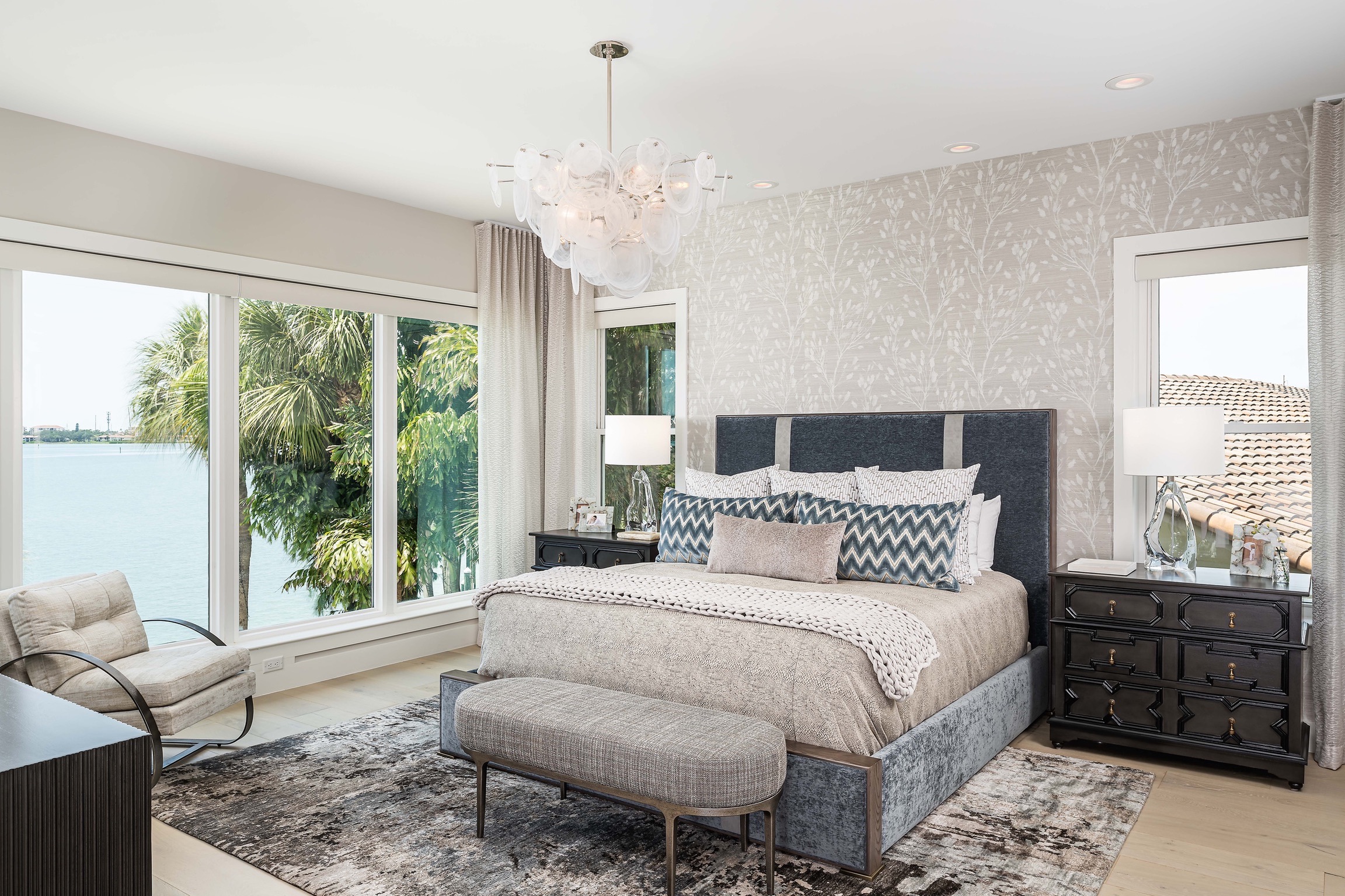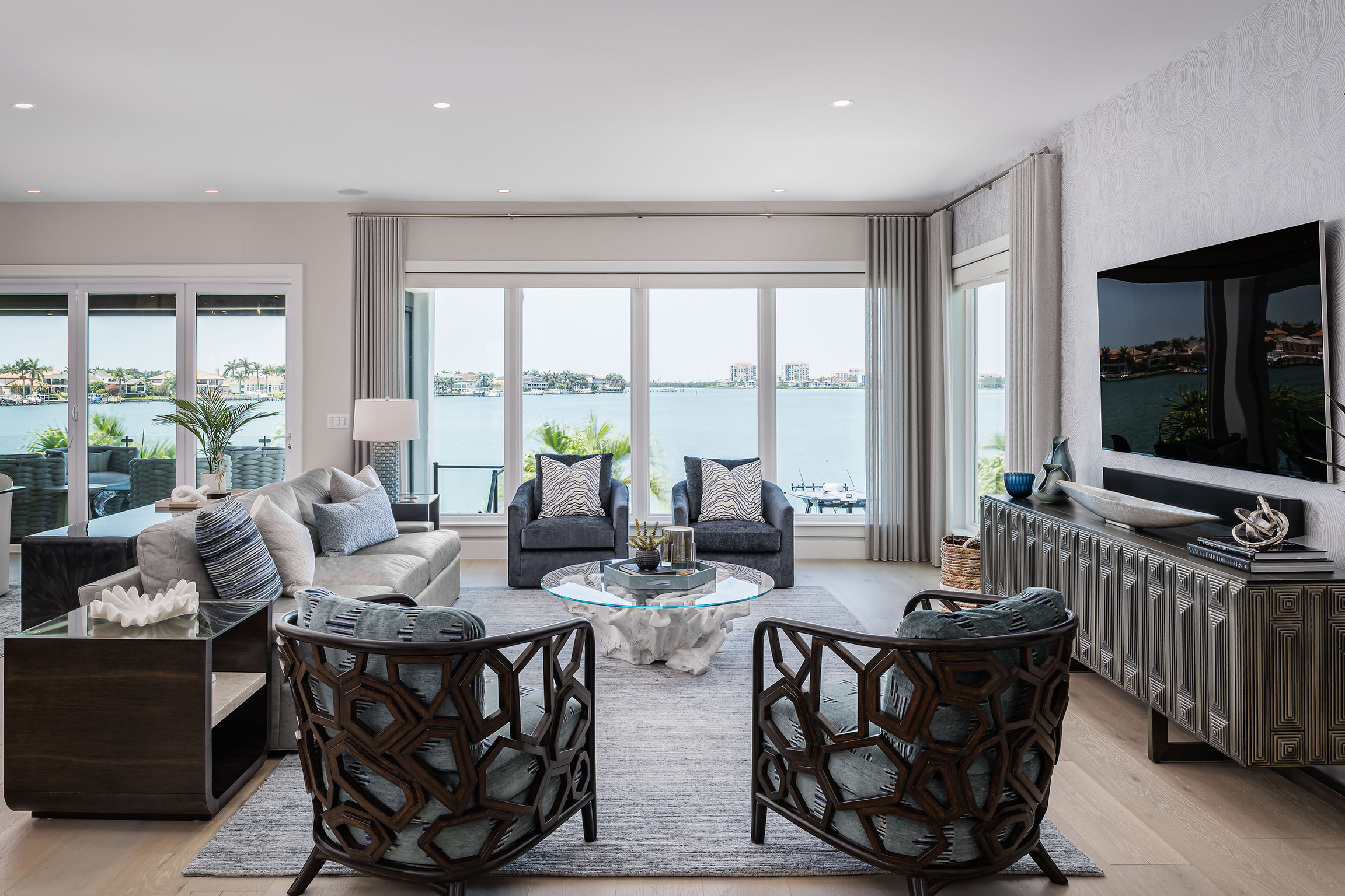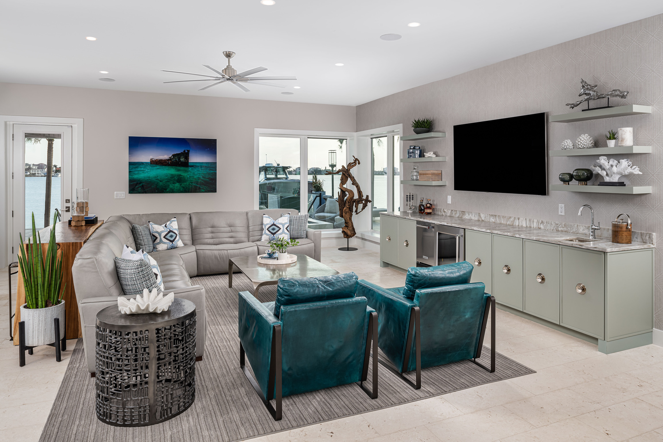 This modern waterfront home was designed with relaxation and hosting in mind. Organic textures and soft neutrals are paired with sculptural forms and subtle coastal motifs. The lower-level lounge, complete with a full bar and panoramic views, blends comfort with elegance. A spa-like bath features blue tilework and natural wood tones, adding warmth to clean minimalism. Outdoor living spaces and a bold stone façade reinforce the connection to nature while maintaining a polished, contemporary aesthetic.