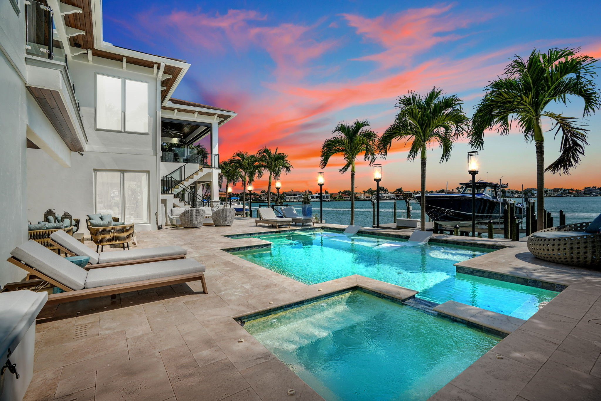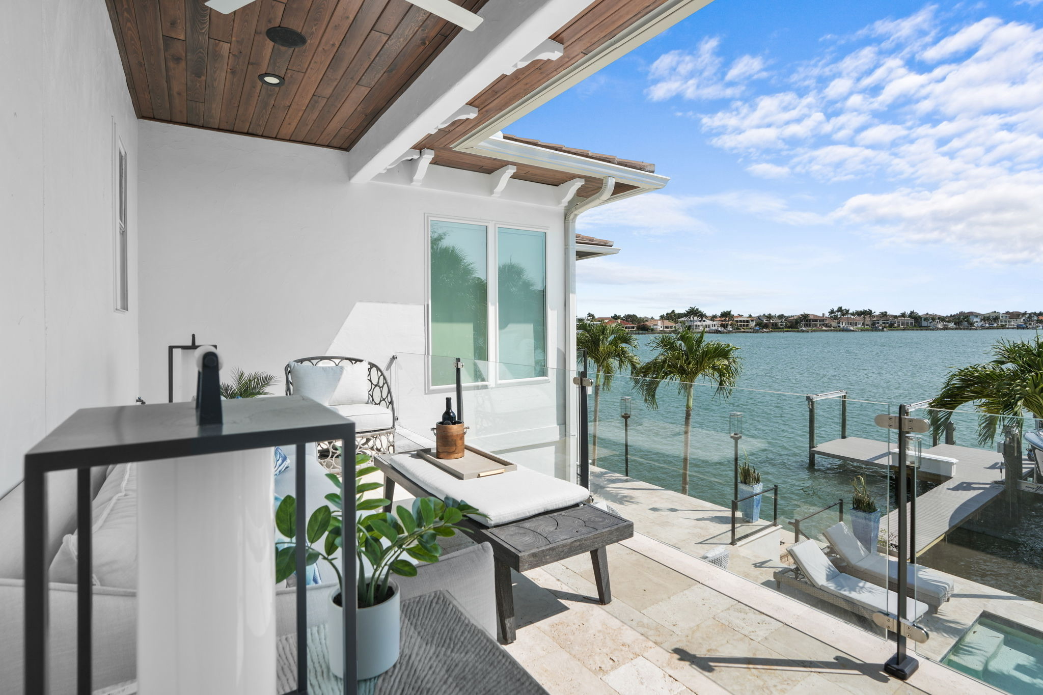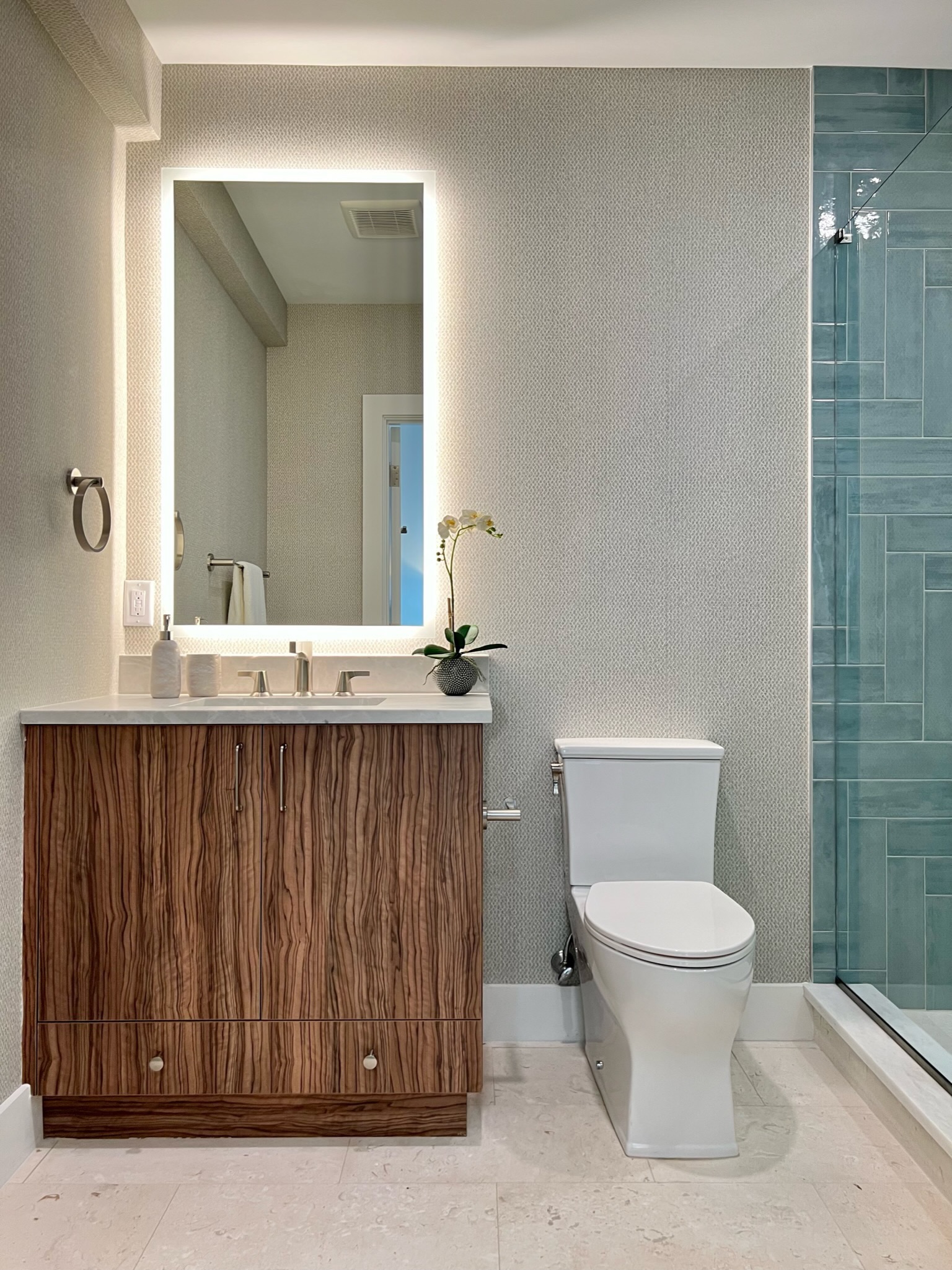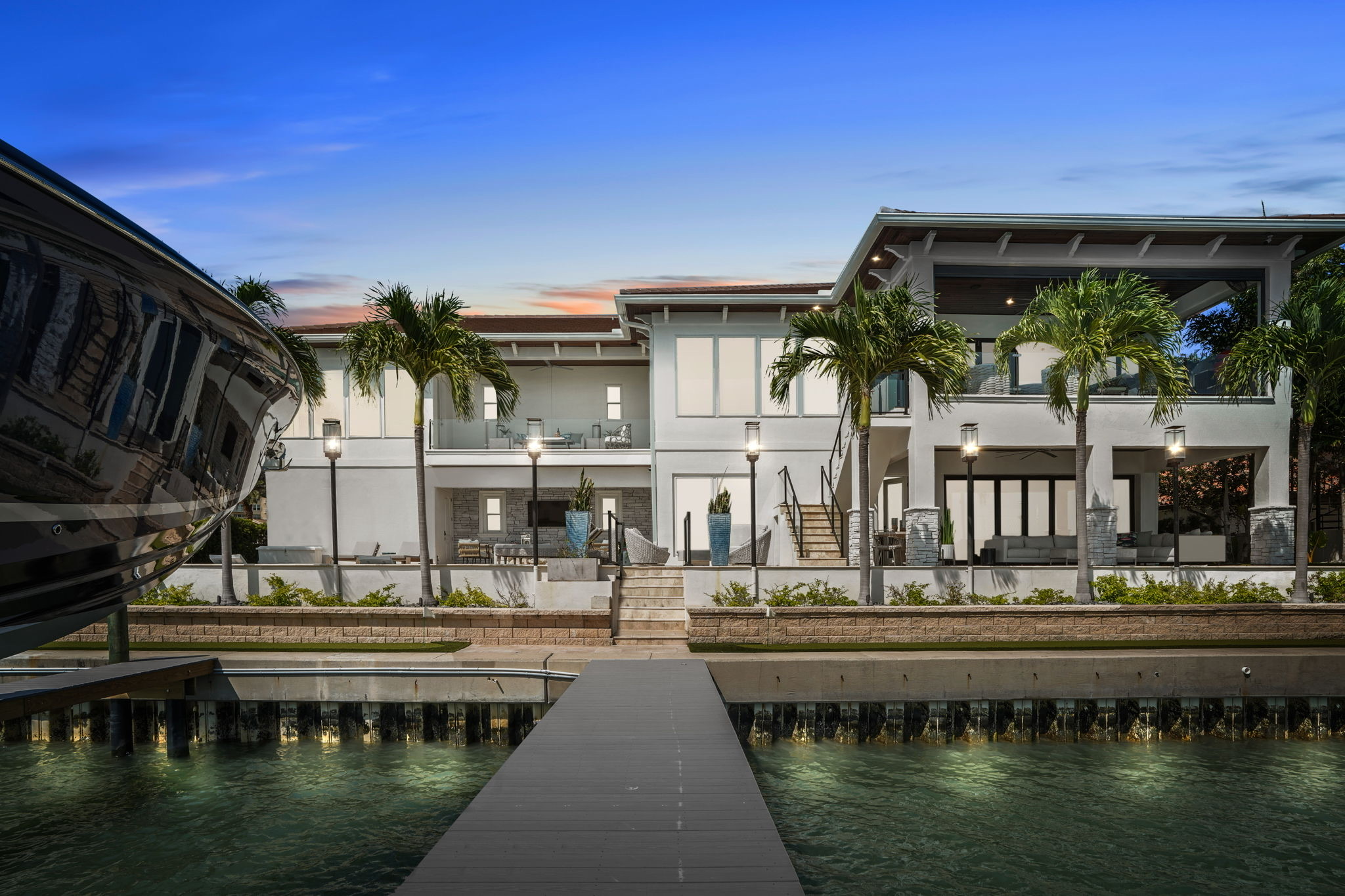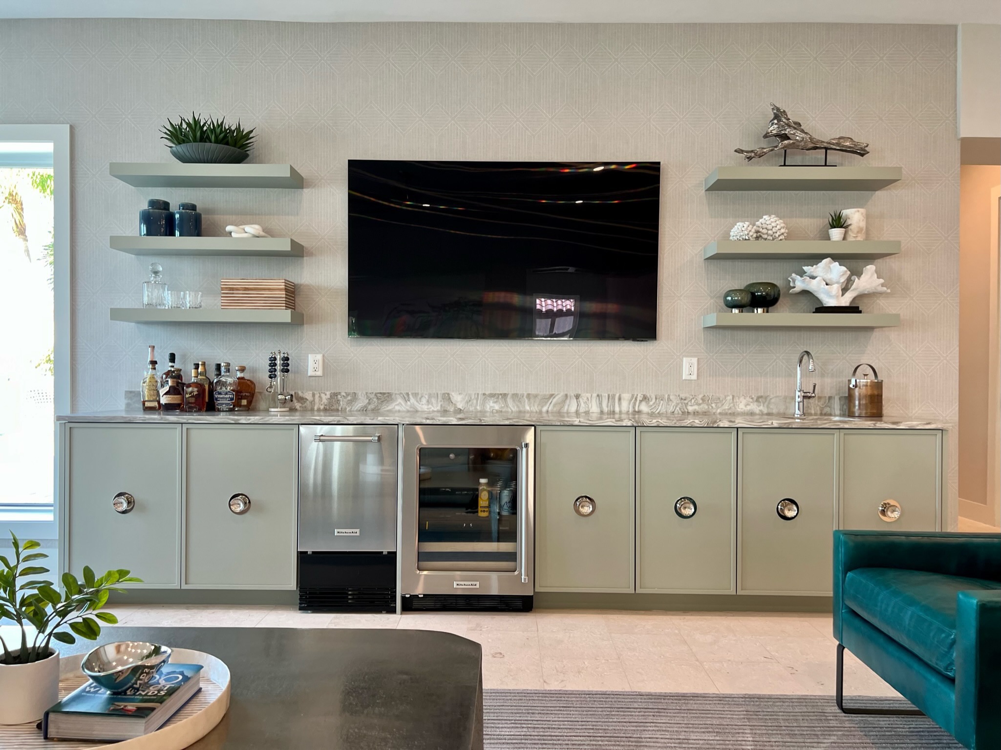 This modern waterfront home was designed with relaxation and hosting in mind. Organic textures and soft neutrals are paired with sculptural forms and subtle coastal motifs. The lower-level lounge, complete with a full bar and panoramic views, blends comfort with elegance. A spa-like bath features blue tilework and natural wood tones, adding warmth to clean minimalism. Outdoor living spaces and a bold stone façade reinforce the connection to nature while maintaining a polished, contemporary aesthetic.